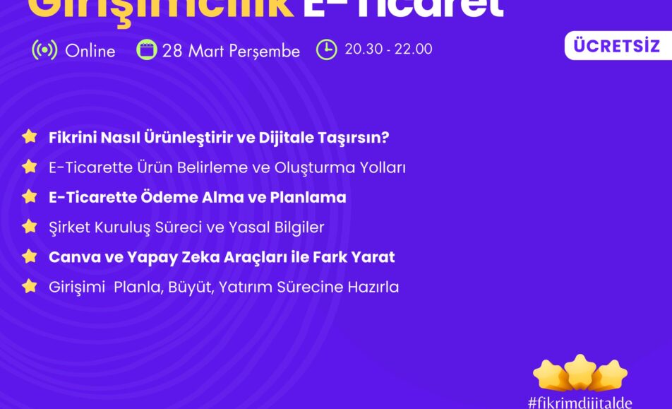 Dijital Dünyada Girişimcilik ve E-Ticaret Etkinliği Fikirlerinizi Dijitale Taşıyın ve Başarıya Ulaşın! Girişimcilik dünyasına adım atmak veya mevcut işinizi dijitale taşımak mı istiyorsunuz? O zaman bu etkinlik tam da size göre! İkas, StartupMarket, Fongogo, Mükellef, Canva markalarının bir araya geldiği...