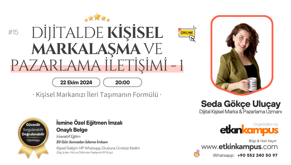 #15 Dijitalde Kişisel Markalaşma ve Pazarlama İletişimi – 1 Kişisel markanızı dijital dünyada ileri taşımanın yollarını öğrenmek ister misiniz? Dijital pazarlama ve kişisel markalaşma dünyasına Seda Gökçe Uluçay’ın rehberliğinde adım atarak, etkili stratejiler geliştirip rekabette öne çıkma fırsatı yakalayın! Bu...