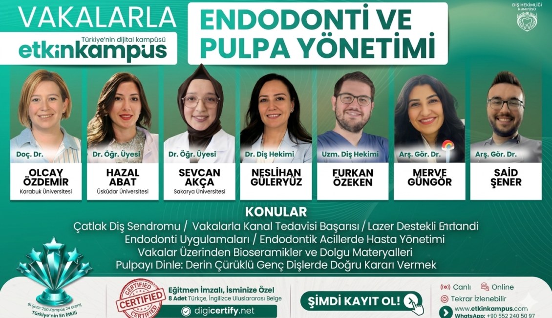 Endodonti dünyasında teori ile pratiği birleştirmeye hazır mısınız? Etkin Kampüs farkıyla düzenlenen “Vakalarla Endodonti ve Pulpa Yönetimi” online eğitim programı, alanında uzman akademisyenler ve diş hekimleriyle kapılarını aralıyor.