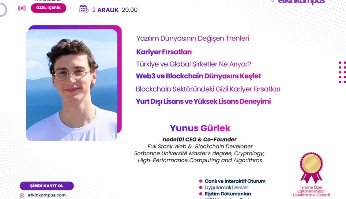 Kariyerini blockchain tabanlı projeler üzerine kuran ve global ekosistemde aktif olarak yer alan Yunus Gürlek, yazılım dünyasındaki en güncel trendleri Etkin Kampüs öğrencileriyle paylaşıyor.