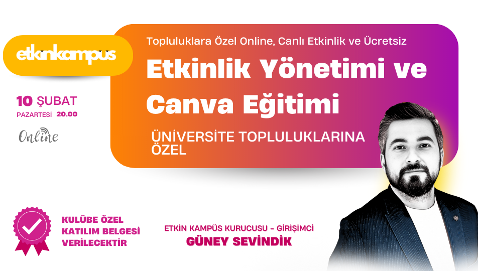 Topluluklar için Etkinlik Yönetimi ve Canva Eğitimi 10 Şubat’ta ücretsiz ve online olarak gerçekleşecektir. Katılımı Zirveye Taşıyacak Etkinlikleri Nasıl Planlarsınız? Katılımcı sayısını artırmanın altın kuralları nelerdir? Etkinliklerinizi Viral Hale Getirecek Stratejiler Nelerdir? Kalabalıkları çekmek için hangi pazarlama tekniklerini kullanmalısınız? Canva...