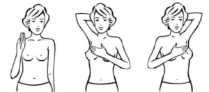 Sırasıyla; “kollar iki yanda sarkık ve gevşek iken”, “kollar belde iken”, “kollar her iki yandan başın üzerine kaldırılmışken” ( teslim oluyorum pozu) ve son olarak “kollar aşağıda iki yanda ve gövde öne doğru eğilmişken” her iki meme için de gözlemlenmeli. Aşağıdaki belirtilerden herhangi birini görürseniz hekime başvurmalısınız.