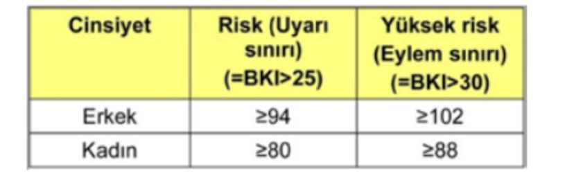 Tek başına bel çevresi ölçümünün erkeklerde 94 cm, kadınlarda 80 cm ve üzerinde olması kronik hastalıklara yakalanma riskinin artmasına neden olmaktadır.