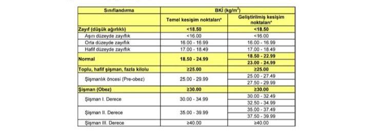 Dünya Sağlık Örgütü (DSÖ) obezite sınıflandırması için BKİ (beden kütle indeksi) ni kullanmaktadır. BKİ: kg\boy 2 (metre cinsinden), formülü ile bulunur. Bu formül bize vücut ağırlığının boya oranla dağılımını gösterir.