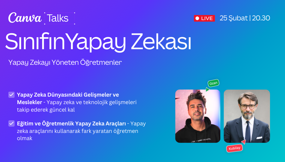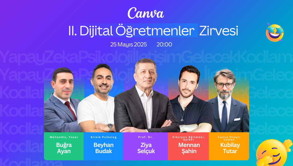 Canva Sahne Başladı! Tıkla ve İzle! Eğitim, Teknoloji, Yapay Zeka ve Canva konuşacağımız o etkinlik Canva Sahne Türkiye’de ilk kez gerçekleşiyor. Prof. Dr. Sinan Canan, Doç. Dr. Saniye Bencik Kangal, Ozan Sihay, Mert Bayantemur ve Kubilay Tutar ile yaratıcı, ilham...