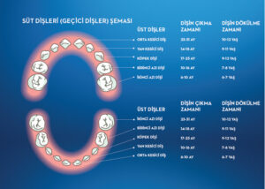 Çocuk doğduktan sonra 6.aydan itibaren çıkmaya başlayıp 30 ila 36.ayda çıkması tamamlanan dişlere süt dişleri denir.Süt dişleri kaç tanedir süt dişlerinin çıkması tamamlanmış bir çocukta üst çenede 10 alt çenede 10 olmak üzere toplamda 20 tane diş bulunur.İlk süt dişi ne zaman çıkar?Çocuk doğduktan sonra 6.ayda alt çenede iki ön keser diş çıkar bu dişlerin çıkması süresinin 9.aya kadar uzaması da normaldir.Diğer süt dişlerinin çıkma zamanı 6. ila 15.aylar arası alt ve üst çenedeki diğer süt ön dişler çıkmasını tamamlar ve böylece çocukta 15.ayda ağızda 8 tane süt dişi bulunur 15 ila  24. aylar arası yan dişler azılar çıkmaya başlar 30.ay sonunda tüm süt dişlerinin çıkması tamamlanmış olur.Süt dişleri ne zaman değişir? 7 yaşında  ön dişlerden başlayarak 8 yaşın sonun sonuna kadar 9 yaşından başlayarak 12 yaşına kadar da diğer süt dişlere değişerek yerlerini daimi dişlere bırakırlar.